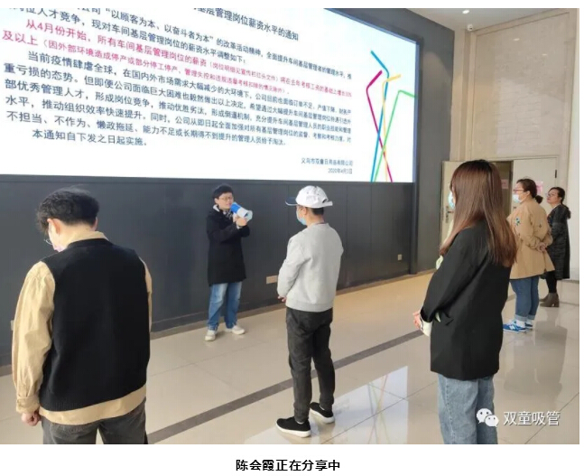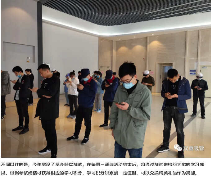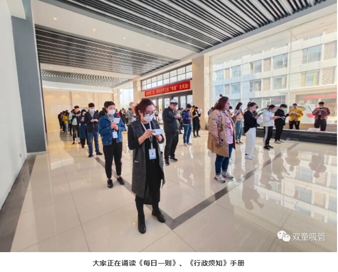 在此期間,大家一同誦讀《每日一則》,《行政須知》手冊等企業(yè)文化內(nèi)容,俗語說:“書讀百遍,其義自見”,通過誦讀活動,將“雙童”的企業(yè)文化灌輸給員工們,根植于員工內(nèi)心深處,潛移默化地改變員工的思維認知!