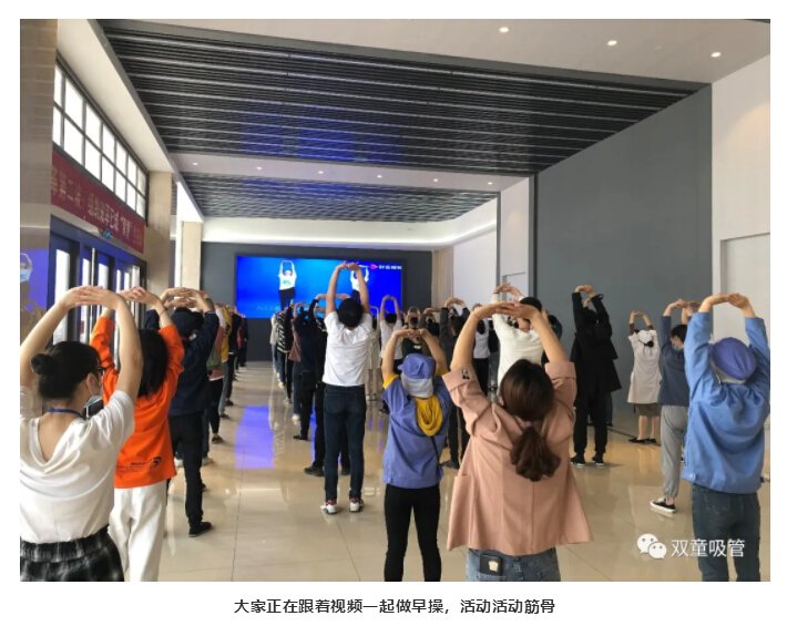 俗話說:“一日之計在于晨,一周之計在于首!”工作雖然很重要,但是我們的身體素質(zhì)也非常重要!因此,每周一在“雙童”新廠區(qū)大廳,員工們列隊整齊,精神飽滿,氣宇軒昂,伴著豪邁的音樂,用整齊劃一的動作做起早操,形成了一道靚麗的風景線。