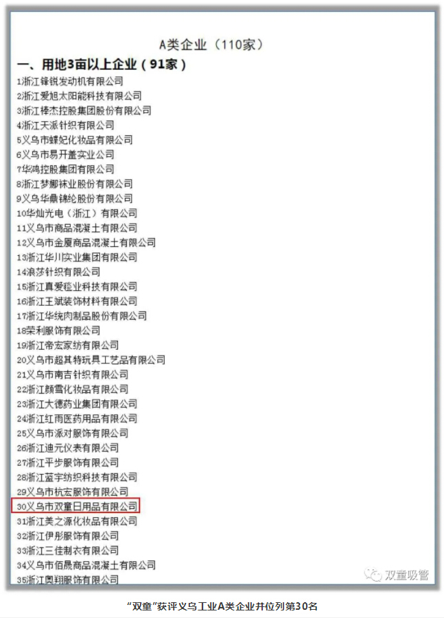 近期,義烏工業(yè)企業(yè)“畝均論英雄”評(píng)價(jià)結(jié)果已出爐。“雙童”在義烏2094家工業(yè)企業(yè)中獲評(píng)A類企業(yè),并取得了前所未有的好成績(jī),從2018年的第62名直線晉升到2019年的第30名!