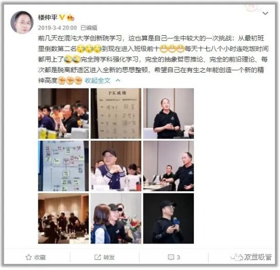2016年年底,樓仲平在偶然間經(jīng)人介紹,接觸到了混沌大學(xué),聽過幾堂課后,他深刻認(rèn)同混沌的知識理念,便果斷開通了混沌大學(xué)的線上學(xué)籍。從此,樓仲平開始了更加迅猛和快速的迭代成長,并一發(fā)不可收拾地進(jìn)入了線下混沌創(chuàng)新院、混沌王東岳學(xué)習(xí)坊的學(xué)習(xí),不斷成長迭代自己,實(shí)現(xiàn)認(rèn)知升級。