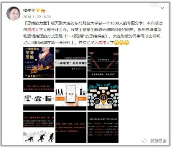 同時,樓仲平將其在混沌學(xué)習(xí)到的理念知識應(yīng)用到“雙童”的經(jīng)營實(shí)踐中,并形成了自己的一套經(jīng)營課件,不僅作為學(xué)霸校友先后去各個省會的混沌分社做分享,更是成為了十多所大專院校的客座教授和兼職教授,幾乎每周都會受到各大院校邀請分享自身的經(jīng)營理念。