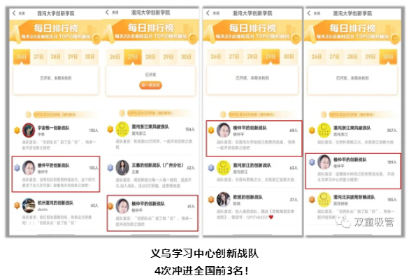 比賽進行期間,義烏學習中心的小伙伴們絞盡腦汁、竭盡全力,讓義烏中心創(chuàng)新戰(zhàn)隊的成員陣容不斷擴大,從而在幾百個創(chuàng)新戰(zhàn)隊中脫穎而出,創(chuàng)下了連續(xù)4天進階全國前3名的好成績!