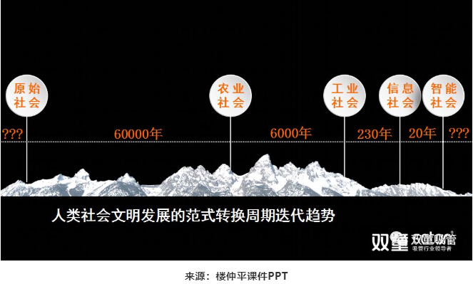 從這頁(yè)PPT中,我們可以看到,人類從原始社會(huì)過渡到農(nóng)業(yè)社會(huì),經(jīng)歷了60000年;從農(nóng)業(yè)社會(huì)過渡到工業(yè)社會(huì),經(jīng)歷了6000年;從工業(yè)社會(huì)過渡到信息社會(huì),經(jīng)歷了230年;而從信息社會(huì)過渡到智能社會(huì),人類僅僅需要20年。這說明在人類社會(huì)文明發(fā)展的過程中,范式轉(zhuǎn)換的周期變得越來越短。