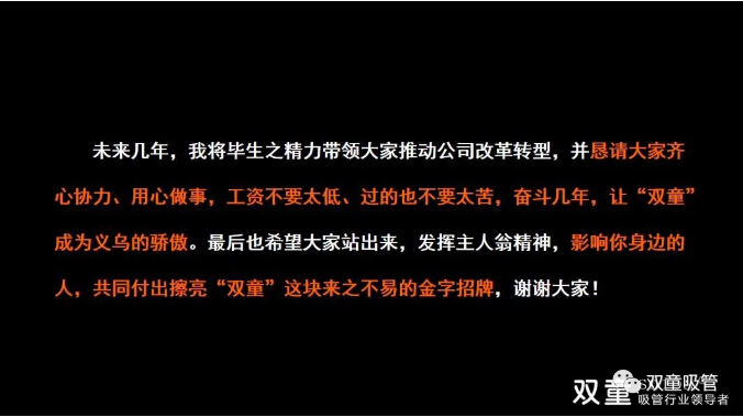 最后,樓仲平鄭重和大家承諾:未來幾年 ,我將帶領(lǐng)大家推動(dòng)公司改革轉(zhuǎn)型,希望大家齊心協(xié)力,用心做事,從而讓大家在付出血汗后,工資不會(huì)太低,過的不會(huì)太苦,少受委屈,獲得尊重。我會(huì)盡心盡力鼓勵(lì)你們,推動(dòng)你們,助長你們,我們共同來支撐“雙童”走向未來!