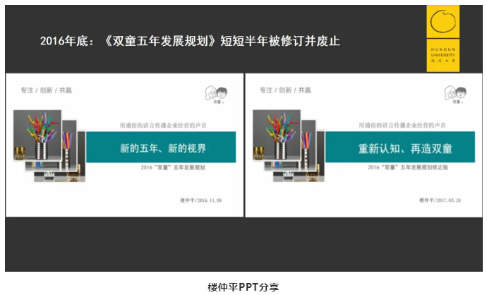 但2015年以后,在持續(xù)增長(zhǎng)受限的現(xiàn)實(shí)情況下,我們逐漸意識(shí)到原來的“經(jīng)驗(yàn)”已經(jīng)逐漸失效,原本所謂的“成功模式”已經(jīng)不適用于“雙童”未來發(fā)展訴求。面對(duì)時(shí)代的不確定性,雙童第四個(gè)《五年發(fā)展規(guī)劃》短短半年被修訂并廢止,并明確后續(xù)不再推行《五年發(fā)展規(guī)劃》。