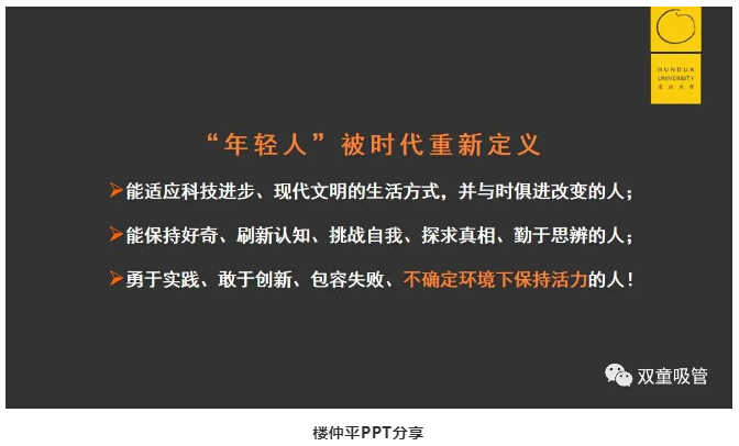 他認(rèn)為:“年輕人”是這個(gè)時(shí)代的主人。他們更能接受新的變化,更能理解新鮮事物,更能獲得新的機(jī)遇。50后、60后、70后們只能更努力地向年輕人靠攏,向年輕人學(xué)習(xí),才不會(huì)被這個(gè)時(shí)代所拋棄,才能在不確定的時(shí)代下保持活力!