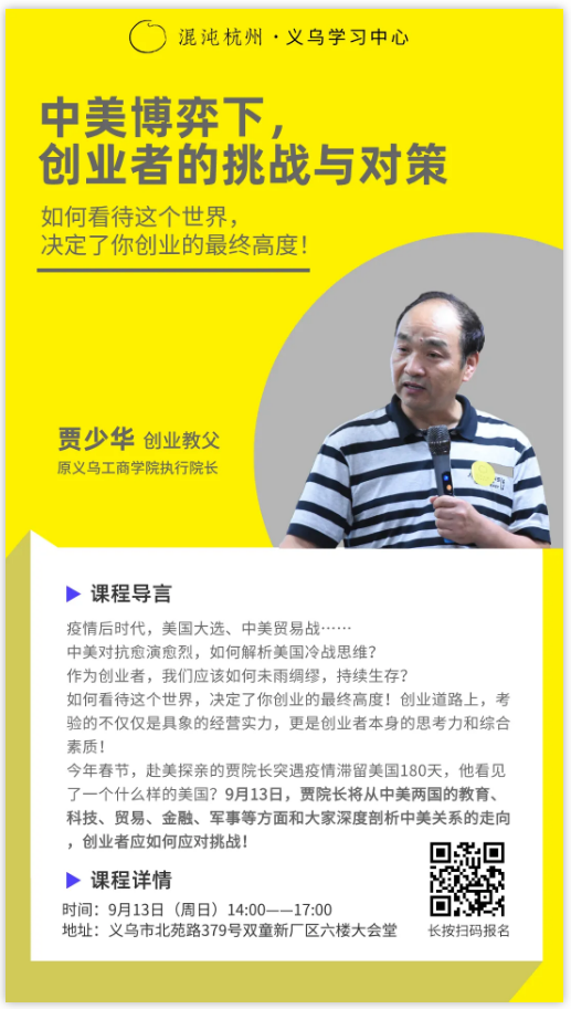 9月13日(周日)14:00~17:00,“創(chuàng)業(yè)教父”賈少華將在混沌大學(xué)義烏學(xué)習(xí)中心,從中美兩國(guó)的教育、科技、貿(mào)易、金融、軍事等方面和大家深度剖析中美關(guān)系的走向,創(chuàng)業(yè)者應(yīng)如何應(yīng)對(duì)挑戰(zhàn)!