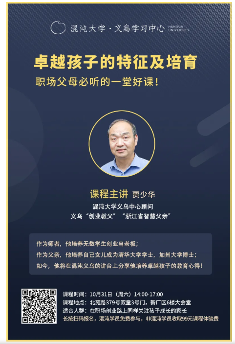 10月31日下午,我們將邀請(qǐng)“混沌大學(xué)義烏中心顧問”賈少華院長,為混沌義烏的同學(xué)們獻(xiàn)上一堂“創(chuàng)業(yè)者子女教育”的饕餮知識(shí)盛宴——《卓越孩子的特征及培養(yǎng):家庭教育的實(shí)踐和藝術(shù)》專題講座,從切身經(jīng)驗(yàn)出發(fā),分享自己培育孩子成為清華大學(xué)學(xué)士、美國加州大學(xué)博士的家庭教育心得。