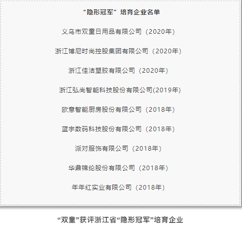 日前,浙江省經濟和信息化廳公布2020年浙江省“隱形冠軍”企業(yè)和“隱形冠軍”培育企業(yè)的名單。“雙童”獲評省“隱形冠軍”培育企業(yè)!