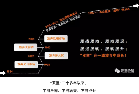 2003年,“雙童”放棄了多元經營,放棄了低價貼牌加工的“大客戶”,提出了“兩條腿走路”和“小客戶原則”;