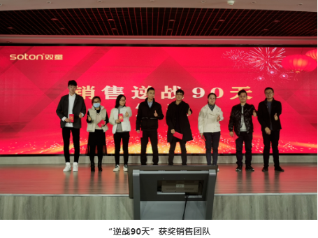 緊接著,“雙童”總經(jīng)理李二橋?yàn)椤澳鎽?zhàn)90天”獲獎(jiǎng)銷售團(tuán)隊(duì)進(jìn)行頒獎(jiǎng)。這些優(yōu)秀團(tuán)隊(duì)在“雙童”疫情危機(jī)之年勇挑重?fù)?dān),甘當(dāng)沖鋒兵,奮戰(zhàn)在銷售一線,為公司開(kāi)辟出一條全新的道路。其中,餐飲組榮獲了30000多元的獎(jiǎng)金,讓員工們羨慕不已!