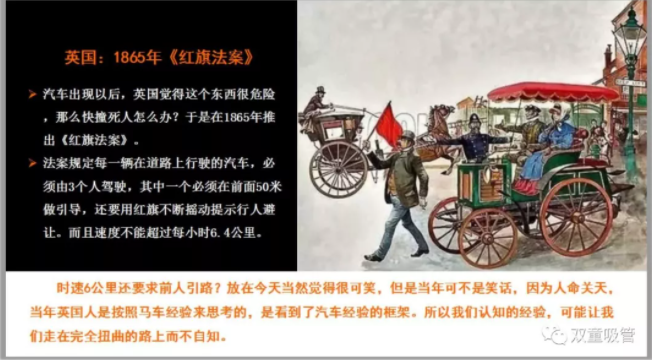 實(shí)際上,這就是“經(jīng)驗(yàn)”在作祟。我們現(xiàn)代人之所以覺得《紅旗法案》很可笑,是建立在我們對(duì)如今汽車的認(rèn)知經(jīng)驗(yàn)上。而當(dāng)時(shí)的英國(guó)人則是建立在對(duì)當(dāng)時(shí)盛行的馬車的認(rèn)知經(jīng)驗(yàn)上。
