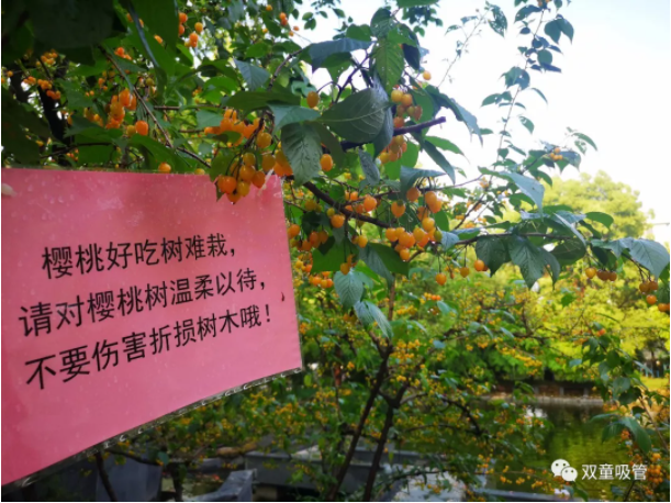 咦?櫻桃樹(shù)上除了有櫻桃,還有一塊牌子呢!原來(lái),為了讓櫻桃樹(shù)更好的生長(zhǎng),“雙童人”在每棵櫻桃樹(shù)上都掛了標(biāo)語(yǔ)牌,提醒大家在摘櫻桃時(shí)不要折損傷害櫻桃樹(shù)。