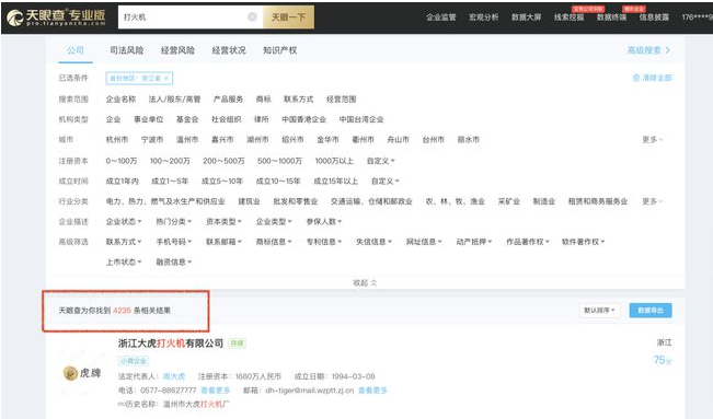 ▲以“打火機(jī)”為關(guān)鍵詞的關(guān)聯(lián)企業(yè)搜索結(jié)果。圖片來源:天眼查專業(yè)版