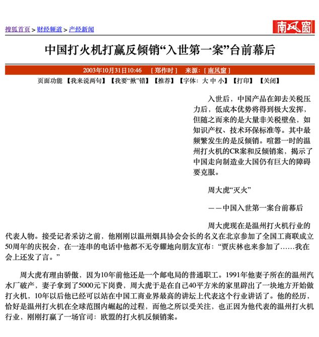 2003年9月,歐盟正式宣布,終止對(duì)中國打火機(jī)的反傾銷調(diào)查,這也是中國加入世貿(mào)組織后,民營企業(yè)應(yīng)訴反傾銷的第一次勝利。