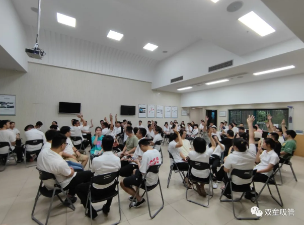 這之后,大家在主持人的引領(lǐng)下,玩起了一個小游戲——馬蘭開花!說到馬蘭開花游戲,是不是有一種回到童年的感覺吶!各板塊成員分批上臺手拉著手圍著主持人走圓圈,一起邊走邊念“馬蘭花,馬蘭花,風(fēng)吹雨打都不怕,請問要開幾朵花?”主持人說:“7朵”,大家就趕快任意7個人抱在一起。
