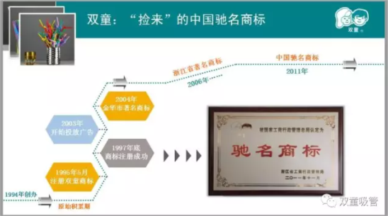 本來關于“雙童吸管”品牌塑造經(jīng)歷的博文,我會在以后創(chuàng)業(yè)經(jīng)歷的博客分享中逐漸提及,但由于前幾天(2011年10月29日)國家工商總局公布了今年新認定的378家“中國馳名商標”名單,“雙童”牌吸管位居其中,15年的創(chuàng)牌之路和所有員工的心血付出,使“雙童吸管”終于站上了中國品牌的最高榮譽殿堂。我考慮再三,決定提早對“雙童吸管”品牌塑造的部分過程故事進行整理,并希望本文能給創(chuàng)業(yè)路上還在猶豫著要不要做品牌的朋友帶來一些啟迪。