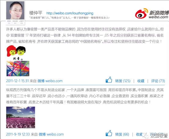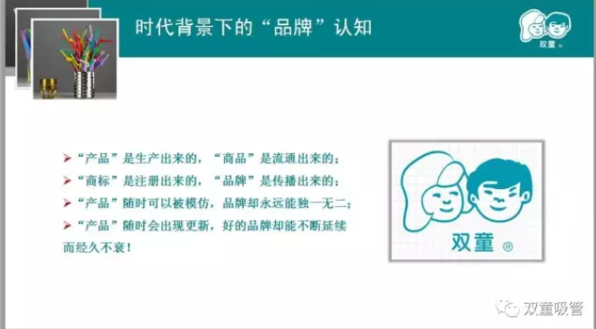 我有一個比較好的習慣就是愿意不斷地學習,我盯住一件事情就會持續(xù)去關注其發(fā)展動態(tài)并做長遠的規(guī)劃,我覺得我們的品牌塑造也是一個由低級到高級的運作過程,積累初期因為沒有經(jīng)驗,只能選擇在一些書刊和戶外廣告的途徑做一些簡單的廣告推廣,之后我們利用互聯(lián)網(wǎng)優(yōu)勢取得突破。再之是致力于企業(yè)的亮點,利用社會化媒體密集傳播而形成口碑傳播??梢哉f“雙童吸管”的馳名商標認定,幾乎不靠廣告推廣,前后十五年的時間,直接的廣告支出幾乎不超過五百萬,而省下來的大部分經(jīng)費都花到企業(yè)文化的價值觀塑造和傳播上。