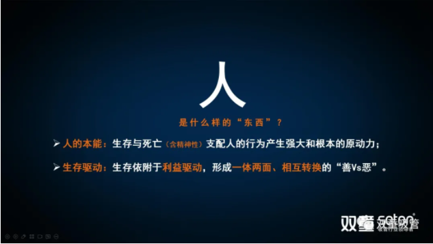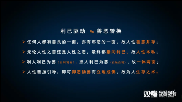從上圖中大家可以看到,無(wú)論人性之善還是人性之惡,其實(shí)都包含“利己驅(qū)動(dòng)”。“利己”是人在長(zhǎng)期的自然環(huán)境中為了獲得生存不得不獲得更多外部資源的內(nèi)在驅(qū)動(dòng)力,從而導(dǎo)致人總是會(huì)從利己的角度去考慮如何更快、更多的獲得。所以“人性本私”是無(wú)可非議的。