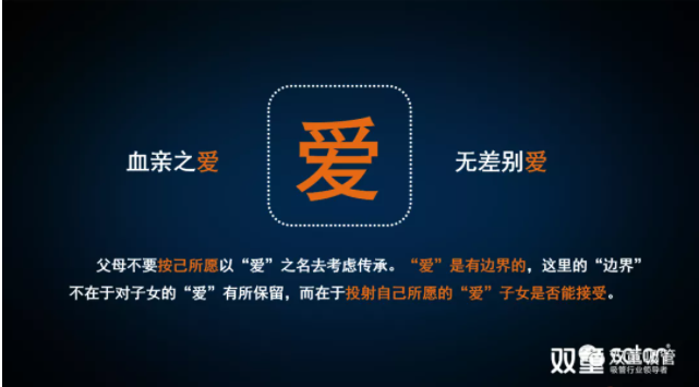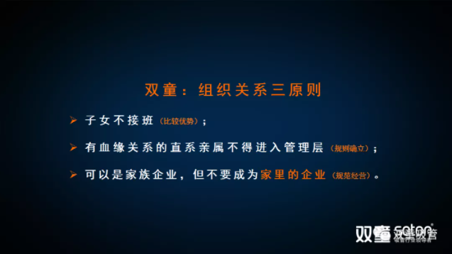 雙童在組織變革后明確形成了“組織關(guān)系三原則”,很多人不理解樓老師在十年前做出的“子女不接班”這樣的傳承安排,樓老師引導(dǎo)大家在傳承問題上沒有絕對(duì)的答案,雙童不讓子女接班并非我大公無(wú)私,而是運(yùn)用經(jīng)濟(jì)學(xué)的“比較優(yōu)勢(shì)”原理充分酌量后選擇的結(jié)果,是綜合考慮了子女的喜好、擅長(zhǎng)、愿景后而得出的合理安排。當(dāng)然期間隱含的信號(hào)卻發(fā)出了巨大的想象空間。大家想想,在一家經(jīng)營(yíng)了近二十年的傳統(tǒng)制造企業(yè)里面: