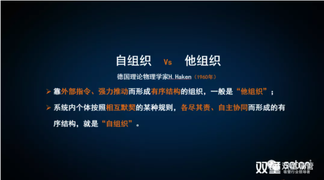 一句話總結(jié)就是把大的企業(yè)做小,做成層級(jí)簡(jiǎn)單、編制靈活的“自組織”結(jié)構(gòu)創(chuàng)業(yè)體來解決企業(yè)的持續(xù)發(fā)展。那么何為“自組織”?