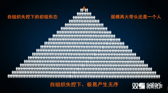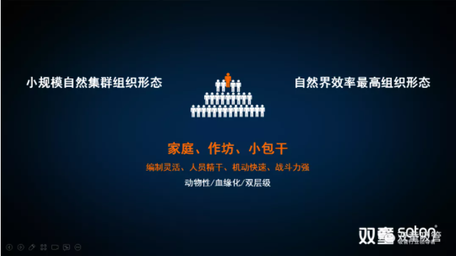 樓老師通過蟻群、猴群、魚群等自然界案例和思維邏輯圖,向大家展現(xiàn)了自然界當(dāng)中普遍存在的自然組織形態(tài)。這種基于動(dòng)物性、血緣化本能而形成的雙層結(jié)構(gòu)的組織形式由于其編制靈活、人員精干、機(jī)動(dòng)快速而戰(zhàn)斗力強(qiáng),是自然界當(dāng)中存在億萬(wàn)年之久的十分高效的組織形態(tài)。
