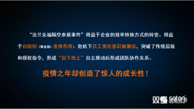 隨后,樓老師通過“法蘭克福隔空參展事件”,讓大家深刻意識(shí)到這種機(jī)制催生的巨大活力?!半p童”第三事業(yè)部在2020年2月疫情危機(jī)下,自主經(jīng)營(yíng)的員工責(zé)任意識(shí)被激活,在眾多不利環(huán)境下突破了傳統(tǒng)層級(jí)和授權(quán)指令,實(shí)現(xiàn)“自下而上”推動(dòng)后形成了緊密的團(tuán)隊(duì)協(xié)作關(guān)系。在眼看參展無(wú)望的絕境下竭盡所能,核心成員通過創(chuàng)新方式和遠(yuǎn)程視頻遙控的方式聘請(qǐng)德國(guó)慕尼黑工業(yè)大學(xué)的留學(xué)生全程參展,從而獲得了五年以來最好的參展效果,在疫情之年取得了驚人的成長(zhǎng)性。