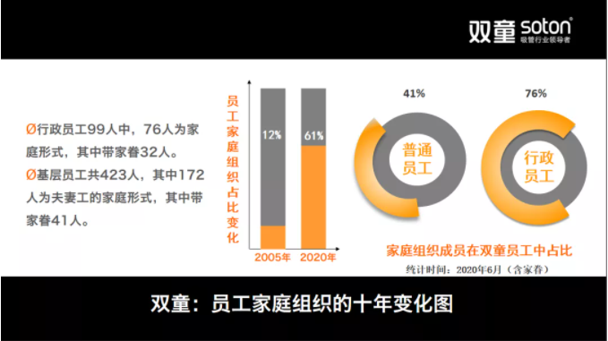 ▲ 60%員工為家庭模式,比05年增加了5倍“雙童”在“家文化”推行過程當(dāng)中,讓員工能夠安心地在公司工作、生活、戀愛,形成了濃厚的“家文化”氛圍!直到現(xiàn)在,已經(jīng)有140個(gè)家庭在“雙童”落戶,其中最多的一家有11個(gè)人住在公司。其中,有的把父母和孩子接過來一起照料,也有單身漢在“雙童”找到人生伴侶,擁有了幸福的家庭。