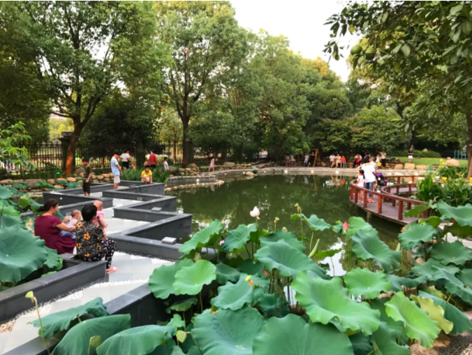 員工和家屬在“雙童”的小花園里散步