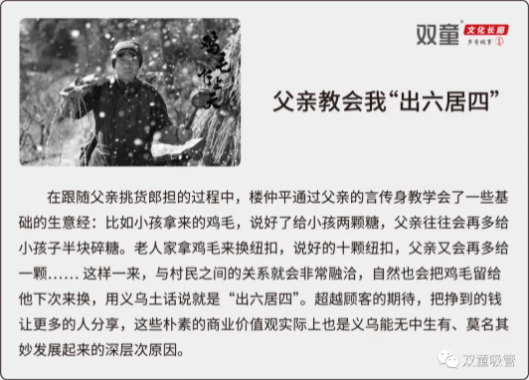 跟隨著爸爸挑貨郎擔(dān)的過(guò)程當(dāng)中,我也學(xué)到了很多東西。 比如說(shuō),在換雞毛時(shí),原本給小孩兩顆糖,爸爸會(huì)再多給小孩半塊碎掉的糖;有些人過(guò)來(lái)?yè)Q紐扣,原本說(shuō)好十顆紐扣,爸爸會(huì)再多給一顆…… 這樣一來(lái),村民們就會(huì)記得我們的好,就算下次別的貨郎經(jīng)過(guò)這里,他們也不會(huì)把雞毛給別人,而是留著給我們。 后來(lái)我才理解這是義烏商人特有的品質(zhì),用義烏土話說(shuō)就是“出六居四”,做生意多給別人一些,要先想別人(利他經(jīng)營(yíng)),超越顧客的期待,讓顧客占點(diǎn)便宜,別人才會(huì)更愿意和你做生意,生意才會(huì)越做越好。 雖然現(xiàn)在義烏人早已不從事“雞毛換糖”,但無(wú)論做生意還是辦企業(yè),都延續(xù)了這一價(jià)值觀,這實(shí)際上也是義烏能發(fā)展得越來(lái)越好的深層原因。