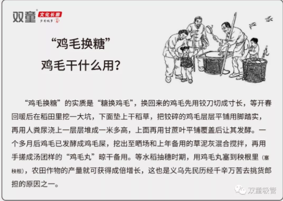 通過(guò)雞毛施肥的水稻會(huì)長(zhǎng)得特別好,而沒(méi)有通過(guò)雞毛施肥的水稻產(chǎn)量則相差很多,當(dāng)然到后面,因?yàn)榛试絹?lái)越多,我們就直接把雞毛撒在水稻田里。除了水稻之外,雞毛還能用于種植甘蔗,在甘蔗種植時(shí)把雞毛埋在下面,通過(guò)雞毛施肥的甘蔗就長(zhǎng)得特別好,種出來(lái)的甘蔗也會(huì)更甜! 其實(shí),像我這個(gè)年齡的人出去挑貨郎擔(dān),經(jīng)歷過(guò)“雞毛換糖”的人已經(jīng)不多了。所以時(shí)代發(fā)展到今天,了解雞毛到底是干什么用的人也就越來(lái)越少。 實(shí)際上 ,我從小就經(jīng)歷了這樣的過(guò)程,把好的雞毛挑出來(lái)拿去賣(mài)錢(qián),腳毛通過(guò)處理作為肥料,這也是我對(duì)“雞毛換糖”最初的記憶。從商業(yè)的本質(zhì)上來(lái)說(shuō),把好的雞毛挑出來(lái)賣(mài)錢(qián)實(shí)際上是把最好的資源配置到最優(yōu)限,余下的腳毛作為肥料也是物盡其用,讓資源最大化!