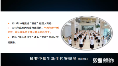 同時(shí),年輕人也能夠得到重用,2013年,“雙童”在完成團(tuán)隊(duì)重組之后,團(tuán)隊(duì)平均年齡不到30歲,大部分都是90后,在制造業(yè)企業(yè)來說,是屬于少有的管理年輕化。