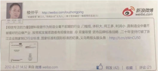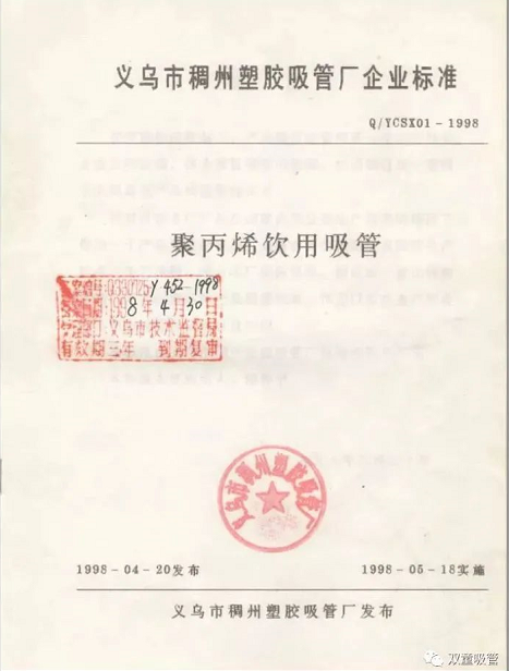 說干就干的樓仲平回去后就查閱各種資料,向義烏市技術(shù)監(jiān)督局借來了當(dāng)時(shí)義烏水泥廠的水泥產(chǎn)品標(biāo)準(zhǔn)借鑒。1998年4月,由雙童前身的義烏市稠州塑膠吸管廠起草的《聚丙烯飲用吸管》正式獲準(zhǔn)發(fā)布,成為當(dāng)時(shí)吸管行業(yè)最早發(fā)布的產(chǎn)品標(biāo)準(zhǔn)。