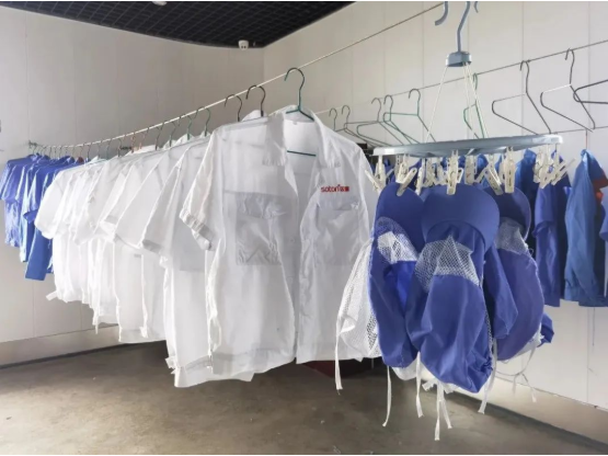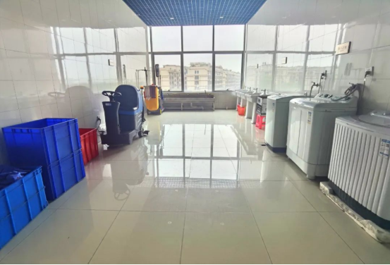 首先,是清洗場(chǎng)所?!半p童”的工服洗衣房就和車間清洗間配置在一起,既聯(lián)通車間,提高工服來回運(yùn)送的效率,又能夠保持相對(duì)獨(dú)立,不影響生產(chǎn)。這里的洗衣工具齊全,既有機(jī)洗區(qū)域,也有供斷電情況使用的手洗池。