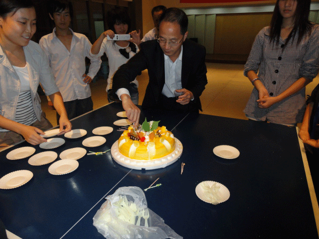 上圖:董事長(zhǎng)樓仲平親自為職工分發(fā)生日蛋糕