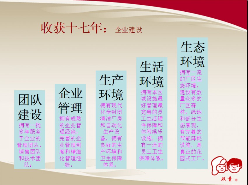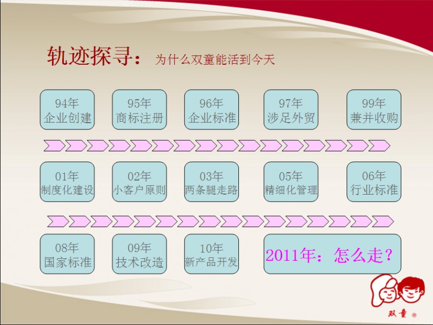 回首過去才能評判現(xiàn)在展望未。9月13日下午的培訓(xùn)課上,樓總主要對《讓雙童走好下一個十年》的企業(yè)規(guī)劃進(jìn)行了講解,樓總首先用PPT向所有管理人員總結(jié)了雙童在過去17年中的成績和經(jīng)驗。