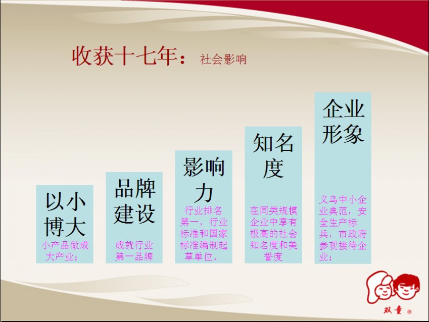 距離2006年雙童的上一個五年規(guī)劃已經(jīng)五年過去了,在這五年中,雙童完成了行業(yè)標(biāo)準(zhǔn)、國家標(biāo)準(zhǔn)的建立,成為吸管行業(yè)國家標(biāo)準(zhǔn)的起草單位;企業(yè)形象和美譽(yù)度得到很大提升,多次被中央電視臺、央視新聞聯(lián)播等節(jié)目專題報道,被譽(yù)為“義烏傳奇”;建設(shè)了義烏工商界首座集綠化和節(jié)能為一體的公司行政大樓,綠色環(huán)保功能得到傳媒界、企業(yè)界的廣泛報道和參觀;獲得了“浙江名牌產(chǎn)品”、“金華市知名商號”、“義烏市百強(qiáng)企業(yè)”、浙江省“清潔生產(chǎn)示范企業(yè)”、“節(jié)能降耗先進(jìn)單位”、“最具社會責(zé)任企業(yè)”等等殊榮。