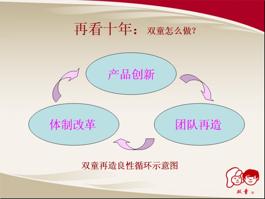 針對這一系列問題,樓仲平董事長從產(chǎn)品創(chuàng)新、團(tuán)隊再造和體制改革三個方面著手,為雙童規(guī)劃了一個良性循環(huán)的發(fā)展之路。
