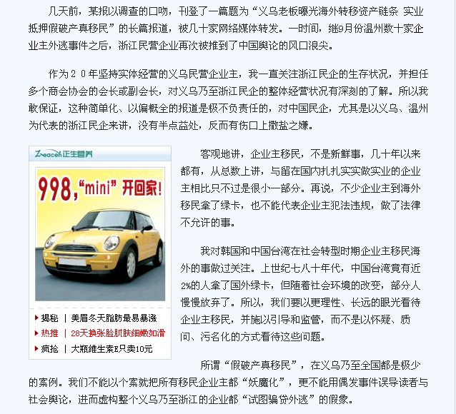 幾天前,某報(bào)以調(diào)查的口吻,刊登了一篇題為“義烏老板曝光海外轉(zhuǎn)移資產(chǎn)鏈條 實(shí)業(yè)抵押假破產(chǎn)真移民”的長篇報(bào)道,被幾十家網(wǎng)絡(luò)媒體轉(zhuǎn)發(fā)。一時(shí)間,繼9月份溫州數(shù)十家企業(yè)主外逃事件之后,浙江民營企業(yè)再次被推到了中國輿論的風(fēng)口浪尖。