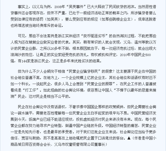 作為20年堅(jiān)持實(shí)體經(jīng)營的義烏民營企業(yè)主,我一直關(guān)注浙江民企的生存狀況,并擔(dān)任多個(gè)商會(huì)協(xié)會(huì)的會(huì)長或副會(huì)長,對(duì)義烏乃至浙江民企的整體經(jīng)營狀況有深刻的了解。所以我敢保證,這種簡單化、以偏概全的報(bào)道是極不負(fù)責(zé)任的,對(duì)中國民企,尤其是以義烏、溫州為代表的浙江民企來講,沒有半點(diǎn)益處,反而有傷口上撒鹽之嫌。