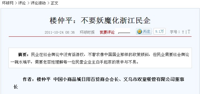 日前,某報(bào)刊登了一篇內(nèi)容為"義烏老板假破產(chǎn)真移民"的長篇報(bào)道,作者以偏概全的不實(shí)報(bào)道對(duì)義烏民營企業(yè)地形象產(chǎn)生了極大的不良影響,對(duì)此,雙童當(dāng)家人樓仲平依據(jù)30多年來對(duì)義烏市場的了解,在《環(huán)球時(shí)報(bào)》上發(fā)表文章《不要妖魔化浙江民企》,澄清義烏民企現(xiàn)狀,抵制不實(shí)報(bào)道,為義烏民企正名。