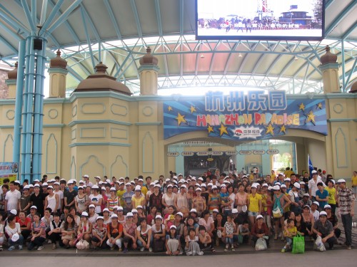 中午十一點(diǎn)鐘,我們出了西湖,再次回到大巴車上,直奔下一個(gè)目的地——杭州樂(lè)園。這里對(duì)于我們 整個(gè)趨于年輕化的旅游團(tuán)隊(duì)來(lái)說(shuō),無(wú)疑是最具神秘感、新鮮感、刺激感的娛樂(lè)天地。到達(dá)杭州樂(lè)園的時(shí)間 是11:30分,先來(lái)張集體大合影。此時(shí),正值午飯時(shí)間,公司已經(jīng)為全體員工準(zhǔn)備好了午餐的餐票。后勤 處保證將餐票發(fā)送到每一位員工手中,玩的心情再急切,也要保障大家不餓著肚子。