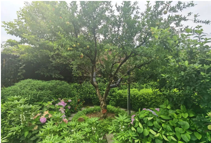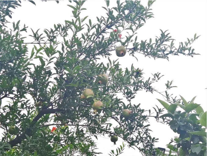 在小花園中央,一直默默無(wú)聞的大樹(shù)也結(jié)果啦!其實(shí)這是一顆石榴樹(shù),上面也結(jié)了不少的石榴果呢!