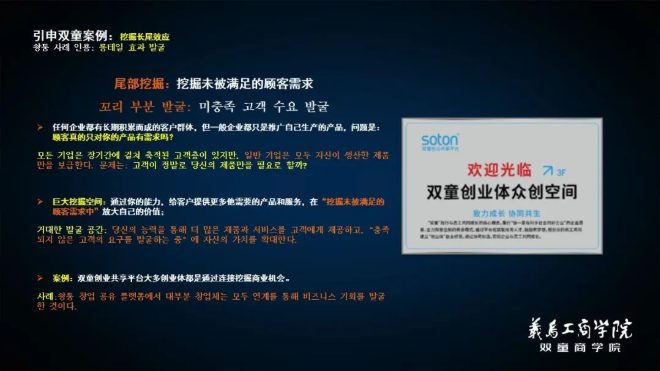 樓仲平課程分享ppt節(jié)選 從逆向思維、長尾效應(yīng)到破界創(chuàng)新,在樓仲平引導(dǎo)下,北大學(xué)子被“與其更好、不如不同”的錯位競爭理念深深的吸引。而韓國的創(chuàng)業(yè)青年們也從中得到啟發(fā),圍繞自身優(yōu)勢,開始不斷思考和尋找未被發(fā)掘的市場需求。