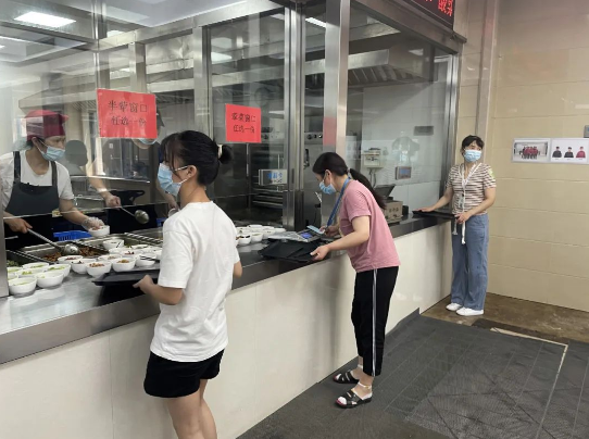 到達餐廳后,由專職人員引導員工在餐前洗手消毒。員工們在排隊取餐時需保持安全距離,就餐時禁止面對面用餐,就餐中做到不交流、少說話,避免交叉感染。