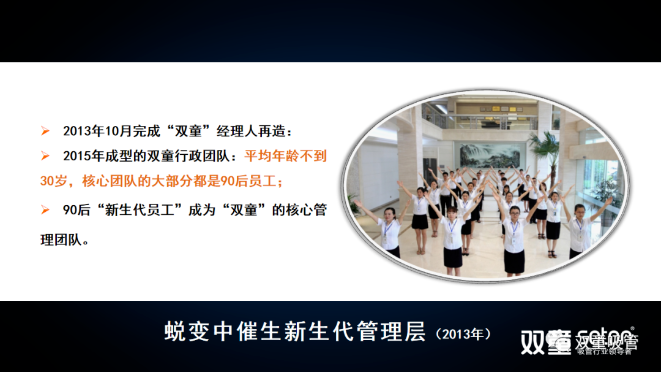 另一方面,新進(jìn)年輕人也能夠得到重用。2013年,“雙童”在完成團(tuán)隊重組之后,管理團(tuán)隊平均年齡不到30歲,大部分都是90后,在制造業(yè)企業(yè)來說,是屬于少有的管理年輕化。