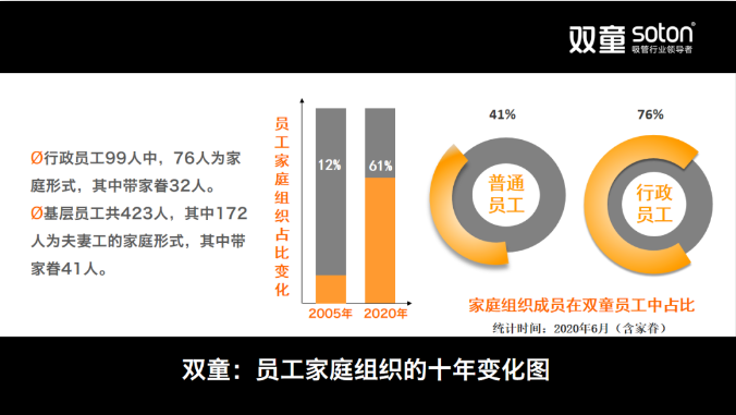 “雙童”在“家文化”推行過程當(dāng)中,讓員工能夠安心地在公司工作、生活、戀愛,形成了濃厚的“家文化”氛圍!直到現(xiàn)在,已經(jīng)有140個家庭在“雙童”落戶,其中最多的有一家11口人住在公司。其中,有的把父母和孩子接過來一起照料,也有的在“雙童”找到人生伴侶,擁有了幸福的家庭。