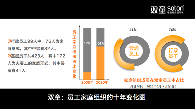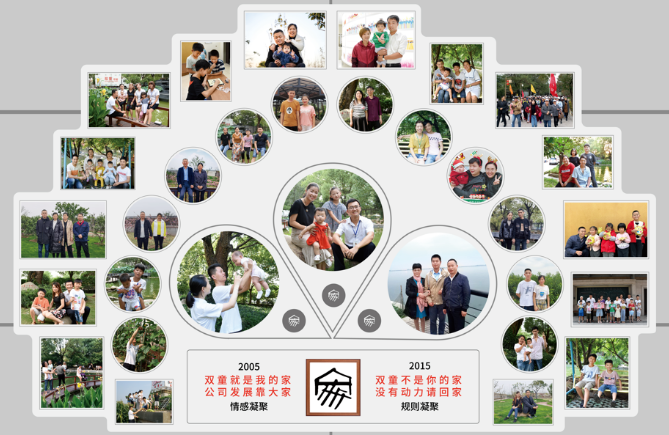 所以啊,“雙童”早期團(tuán)隊(duì)里的很多成員都是內(nèi)部消化的,大家在公司里找到自己的人生伴侶,并生兒育女、組成一個(gè)個(gè)小家庭,最后匯聚成“雙童”這個(gè)大家庭。久而久之的“雙童”家文化就貫徹在每一位員工心中,大家都把公司當(dāng)成了“第二個(gè)家”。