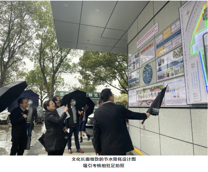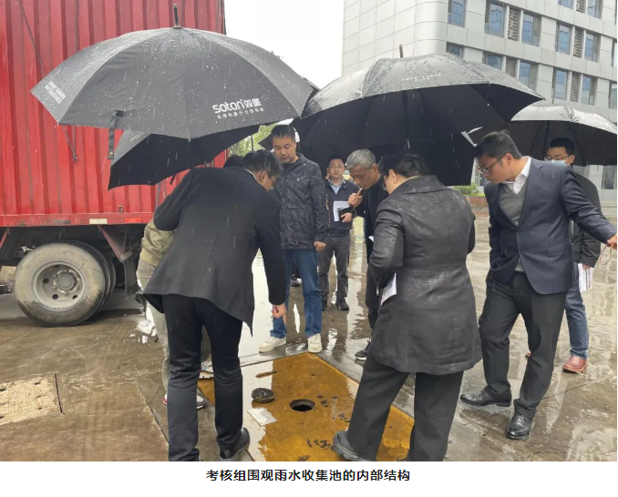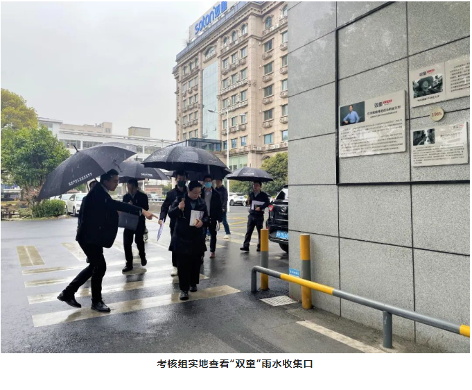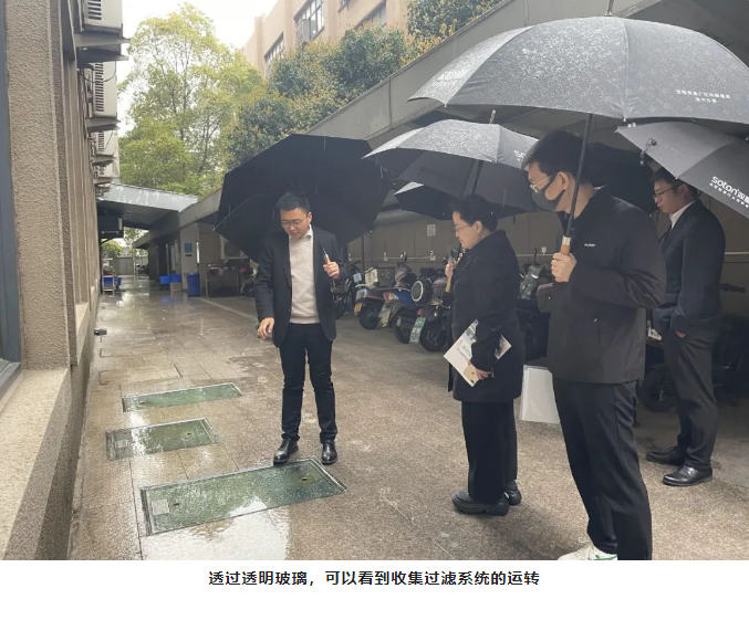 緊接著,考核組一行參觀“雙童”的雨水收集系統(tǒng)。在“雙童”不到40畝的廠區(qū)內(nèi)用雨水代替90%的自來水!這都得益于廠區(qū)內(nèi)的雨水收集循環(huán)利用系統(tǒng)。正巧,調(diào)研當(dāng)日義烏下起了小雨,方便了考核組直接觀察雨水被收集的過程。