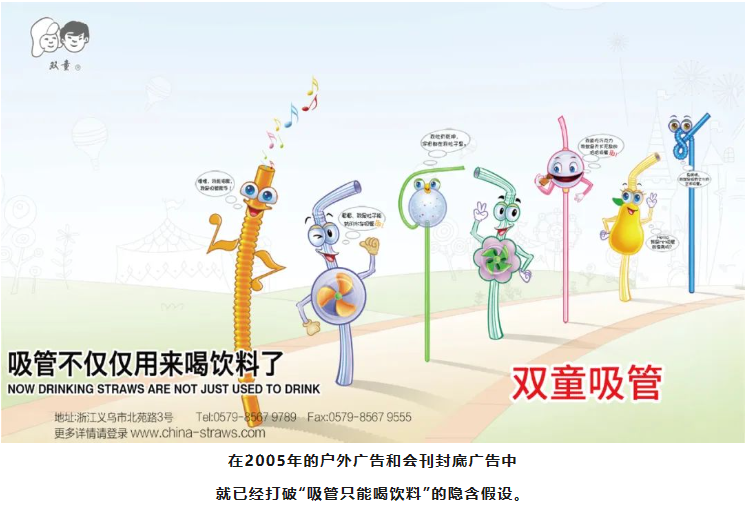 其實早在2004年,“雙童”就打破了“吸管就是喝飲料的”基本假設(shè),通過要素拆解和組合去獲得一個“新組合”,從吸管單一的“喝水”功能向情感化、體驗化和娛樂化延伸,連接到女性和兒童作為消費訴求的全新市場,使產(chǎn)品售價和附加值都得到成倍增長,徹底讓“一根吸管”從“不可能”變成了“可能”。打破了大家對“吸管”的傳統(tǒng)認知,也破除了所謂“吸管僅僅只能用來喝飲料”的隱含假設(shè)!